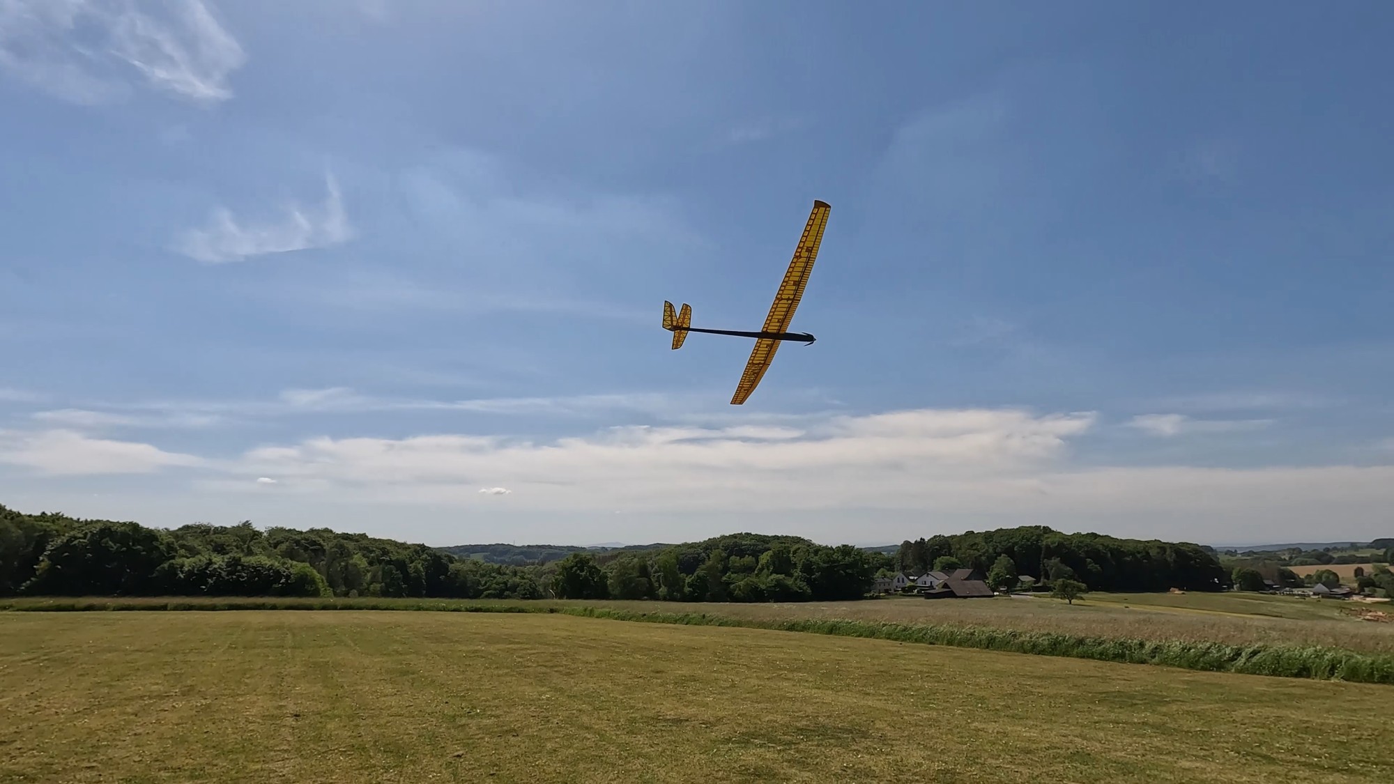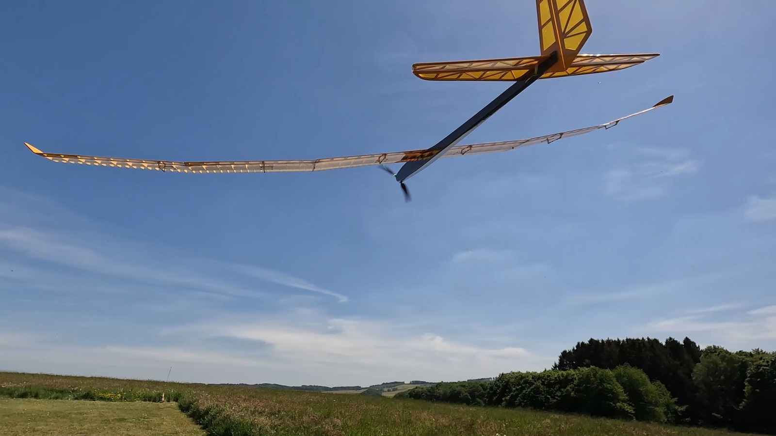 Flugaufnahmen eines Elekroseglers mit einer Spannweite von 3,50 Metren und einem Gewicht von ca. 5 KG. Die Kamera befindet sich hierbei auf der Tragfläche des Modells und fliegt mit.