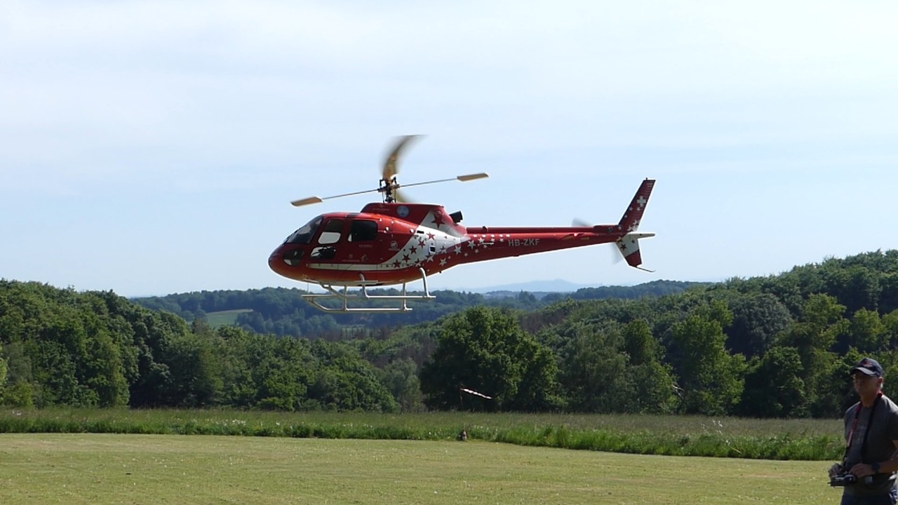 Flugaufnahmen aus nächster Nähe von dem RC Scale Modellhelikopter Eurocopter AS 350 Airzermatt. Die Videoaufnahmen erfolgten durch die zeitgleiche Aufnahme mit 2 Kameras.